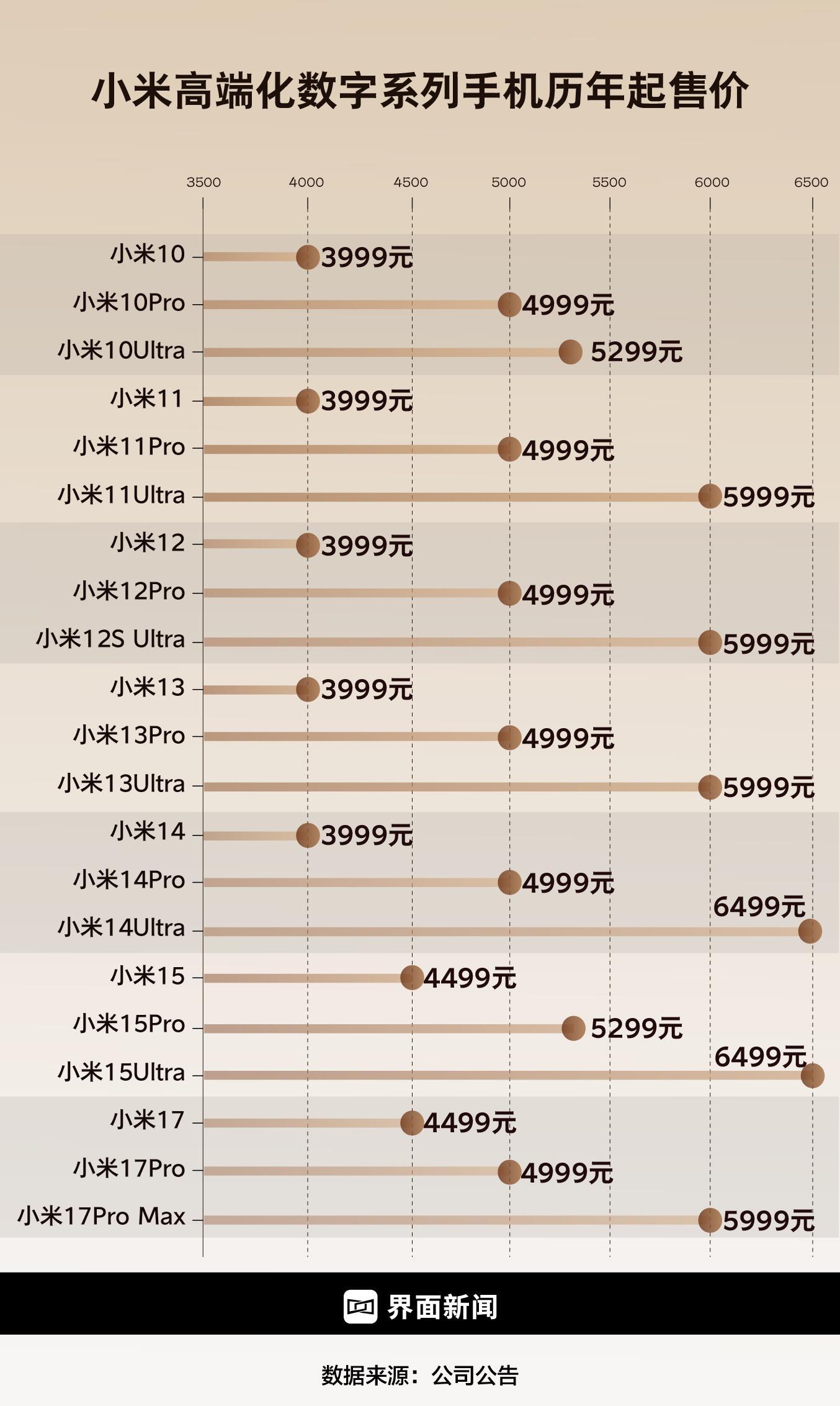 小米高端手机历年起售价。制图:界面新闻