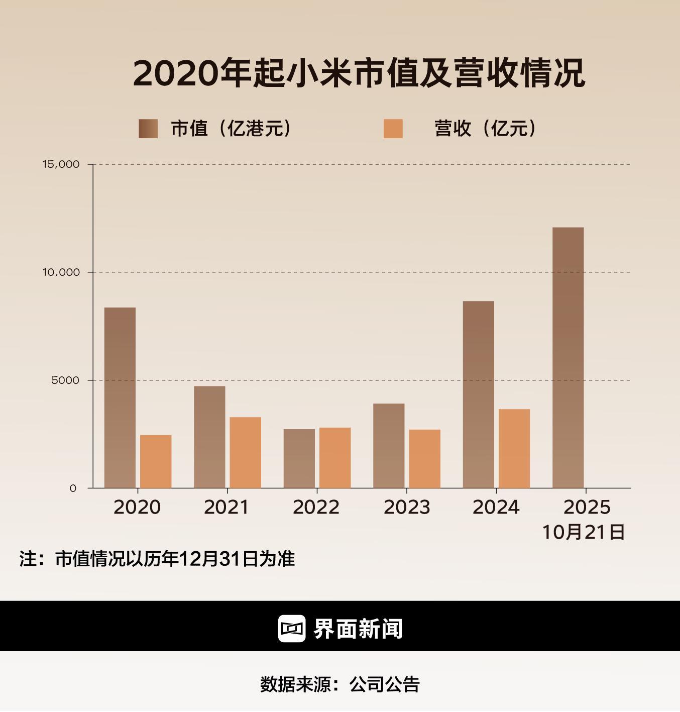 小米近五年市值及营收变化。制图:界面新闻