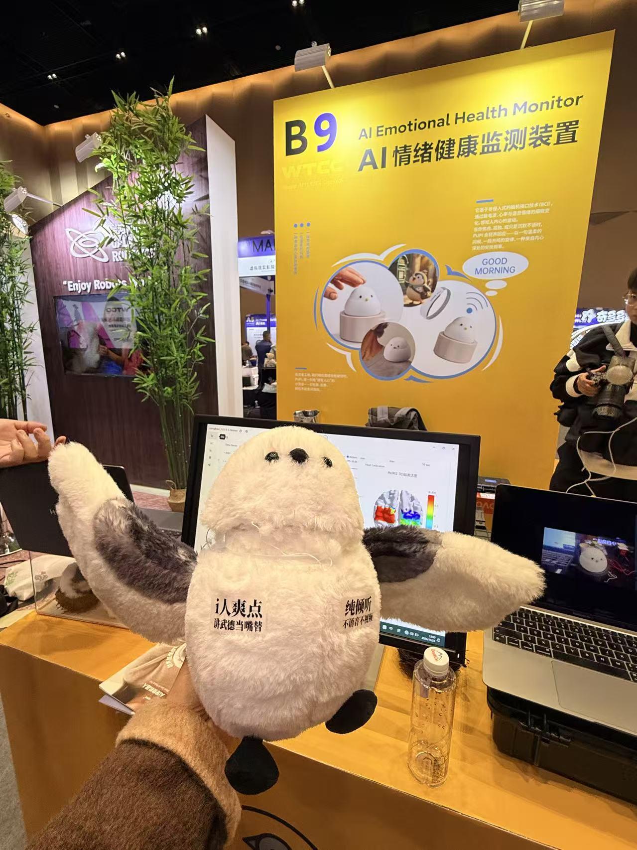 情绪感知赛道同样细分。香港中文大学团队带来的AI情绪感知吊坠,通过毫米波雷达与边缘感知模组,实时分析用户语音、生理及行为特征,提供私密情绪反馈。而灵雀工坊的AI情感陪伴宠物“山雀pupi”则采用脑机检测技术,结合EEG、PPG、ECG等生理信号识别用户情绪,通过肢体动作与振动提供拟真安抚。创始人王子豪透露,未来计划与康养机构合作,推出“AI心理健康管理”产品。