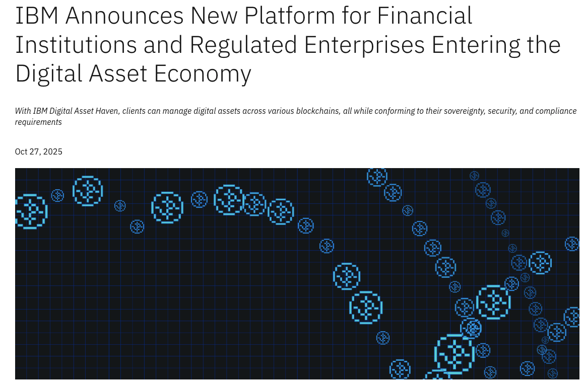 财联社10月27日讯(编辑 史正丞)在大型金融机构与科技公司纷纷探索如何切入加密资产市场的背景下,美国科技巨头IBM近日宣布了一项重要战略:转型成为加密金融领域的“卖铲人”,为行业提供全栈式基础设施服务。