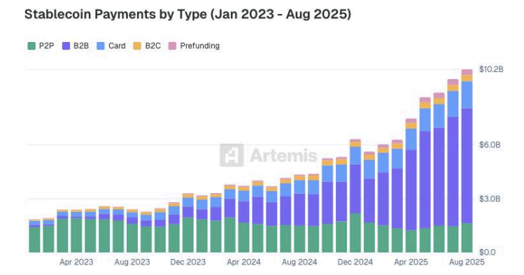 IBM新业务恰逢全球稳定币市场快速增长期。随着美国、欧盟稳定币法案落地,摩根大通、美国银行等机构正联合探索稳定币发行。区块链数据提供商Artemis报告显示,2024年8月稳定币支付金额超100亿美元,同比翻倍,预计2025年全年规模将达1220亿美元。企业级转账已成主流,而消费者点对点交易稳定在每月16亿美元。