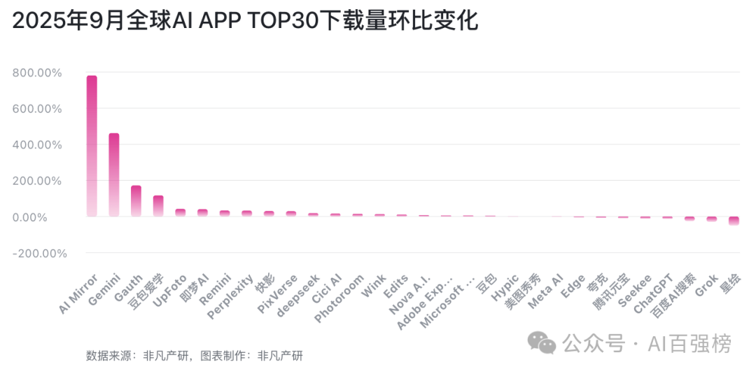 一边是热度攀升:Gemini、AI Mirror、光速写作等新品类拉新势头迅猛。