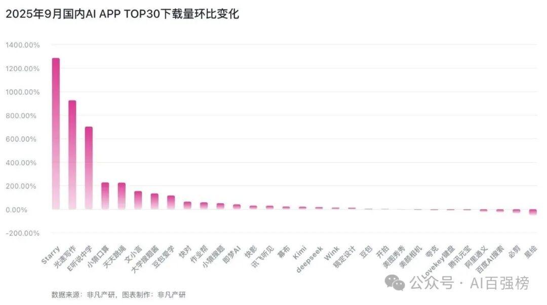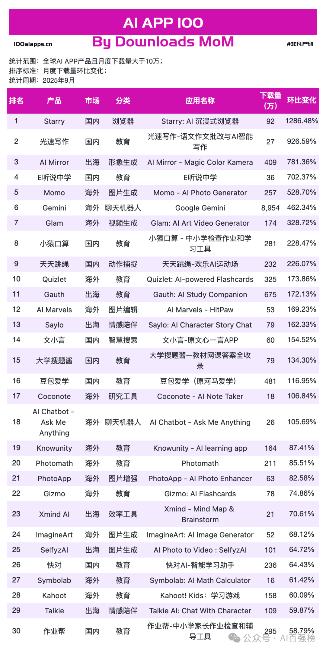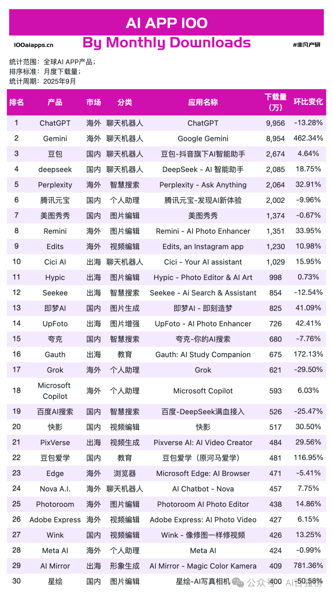 而本报告基于非凡产研对全球 AI APP 产品的九月数据统计(下载量与活跃用户 Top100),从下载结构、留存动能、产品类型、市场构成、头部玩家策略等多个角度,对这个复杂盘面进行拆解。