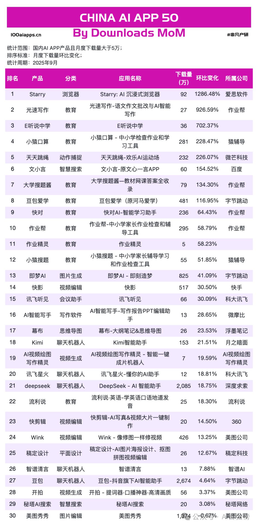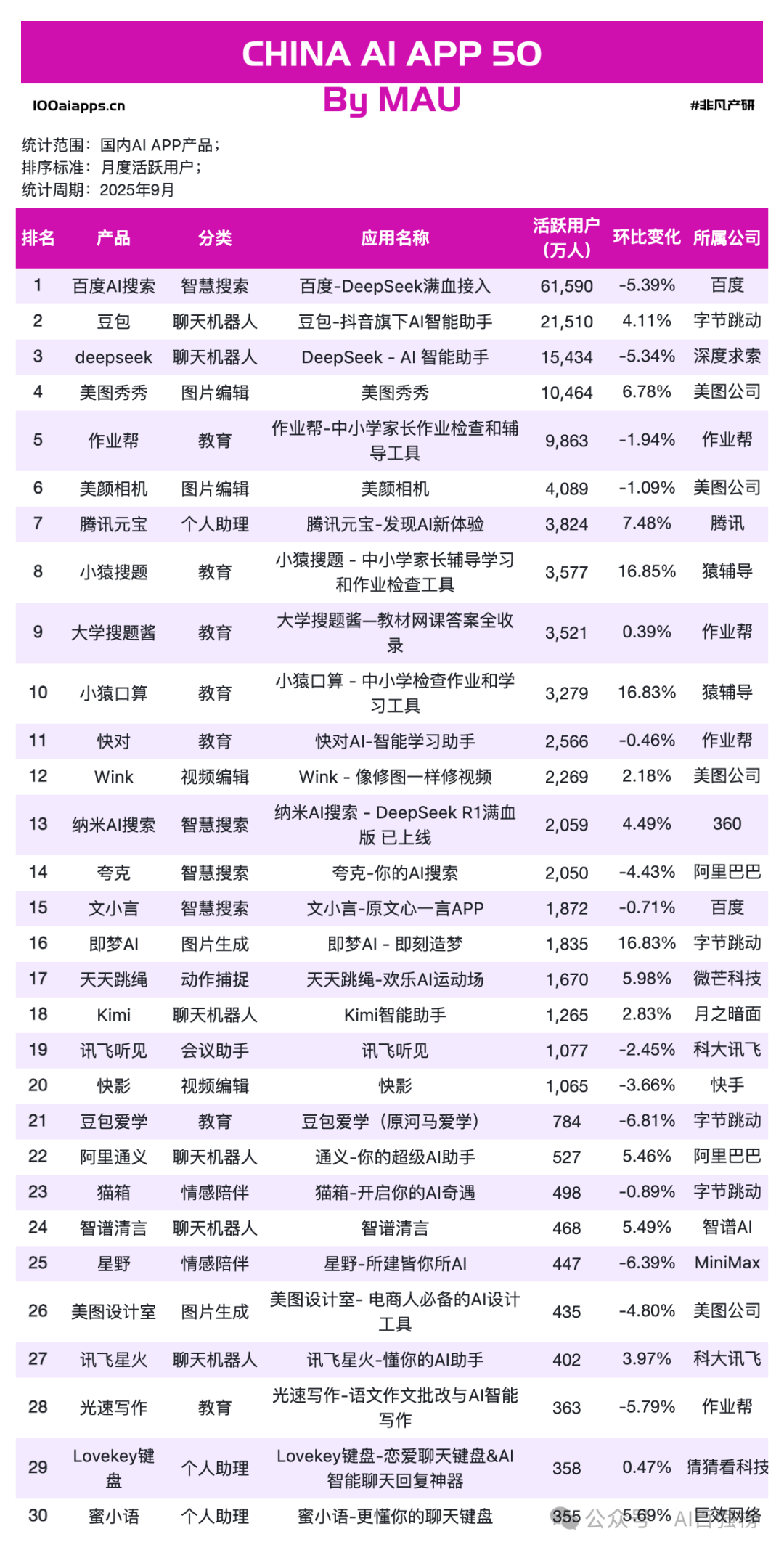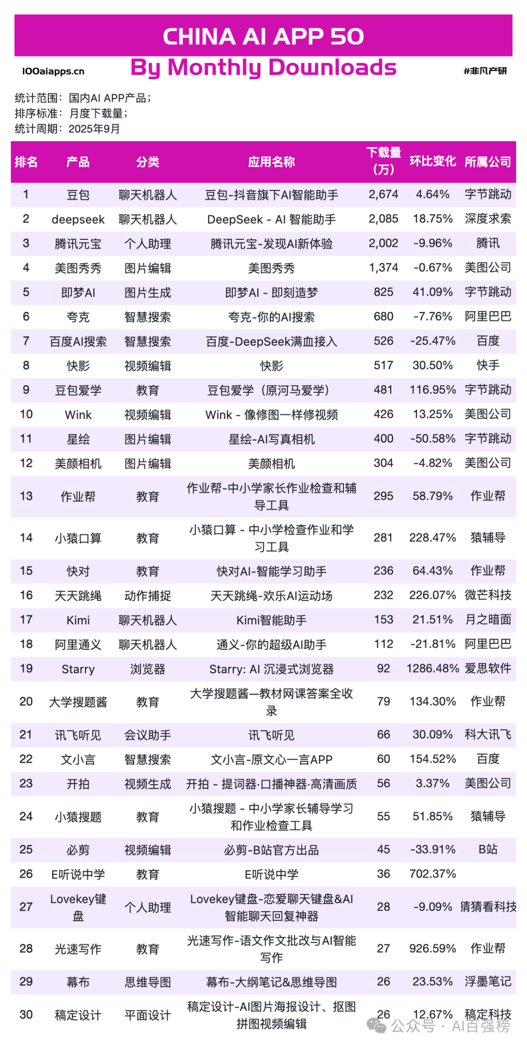 非凡产研发布的2025年9月AI百强榜明细如下: