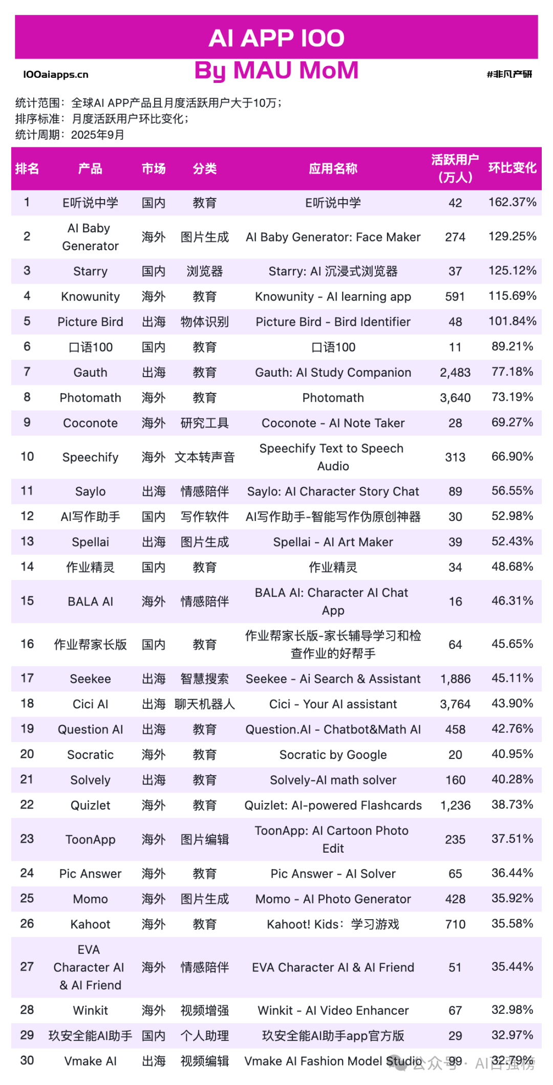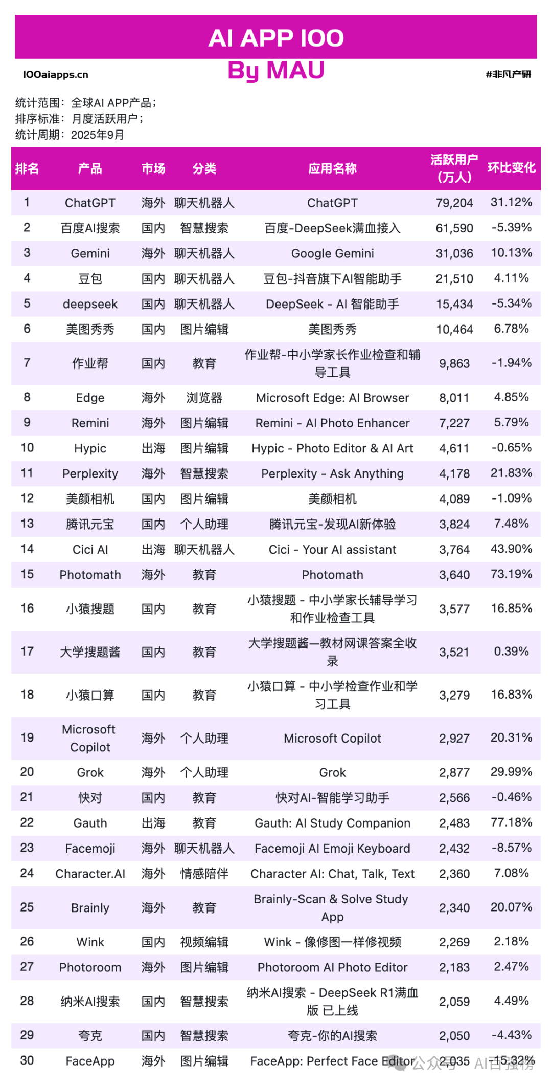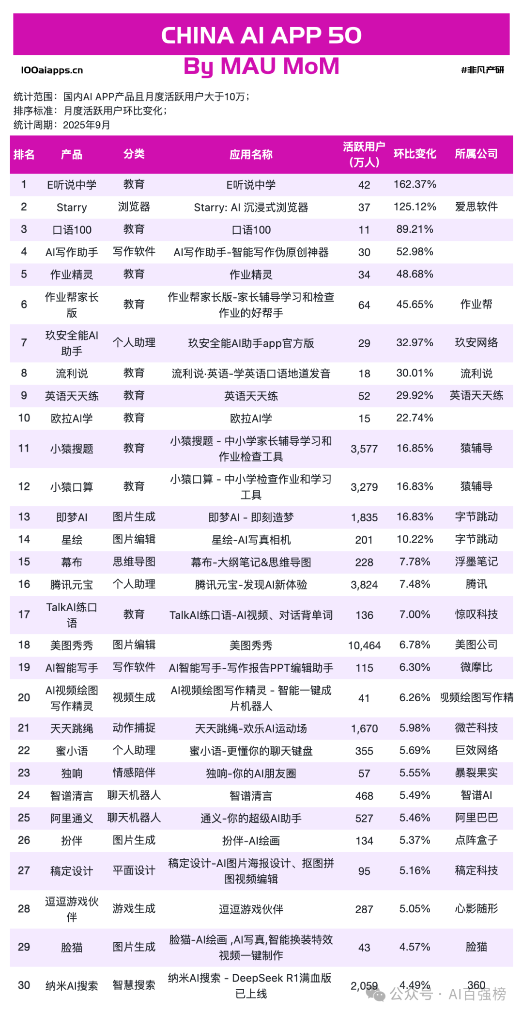 非凡产研发布的2025年9月AI百强榜明细如下: