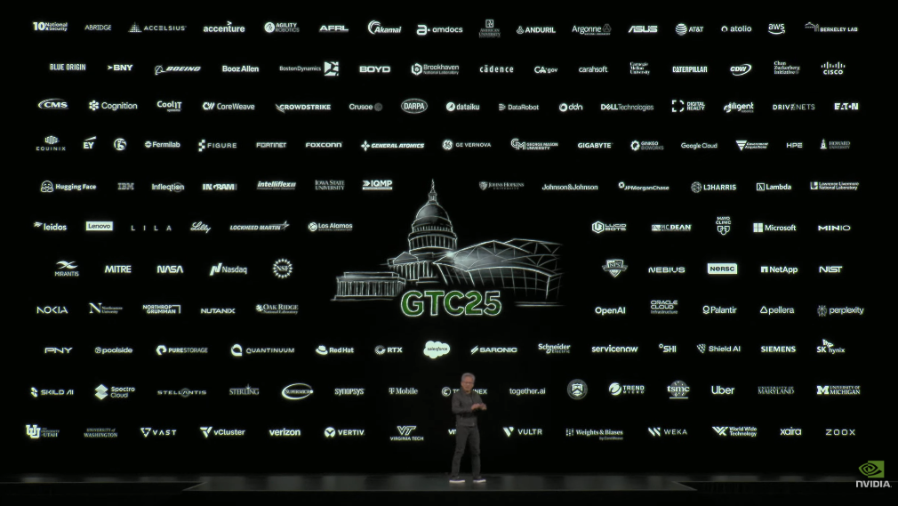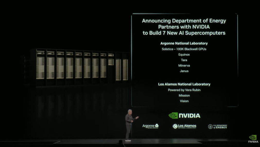 黄仁勋随后宣布,与美国能源部达成协议,将再建设7台超级计算机。这些超算将使用Blackwell和下一代Vera Rubin架构芯片,分别配置在阿贡国家实验室和洛斯阿拉莫斯国家实验室。其中名为Solstice的系统将配备10万块Blackwell GPU,将成为“美国能源部用于科学发现的最大AI超级计算机”。