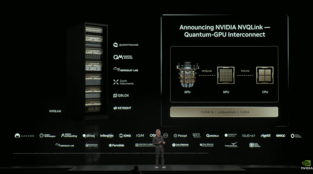 英伟达同时展示了基于CUDA‑Q核心构建的NVQLink,用于连接传统GPU和量子计算机,共同加速量子计算。目前的量子计算对环境噪声高度敏感,且可用性有限,因此需要基于GPU的超级计算机承担起量子处理器的部分负载,支持量子纠错所需的控制算法。