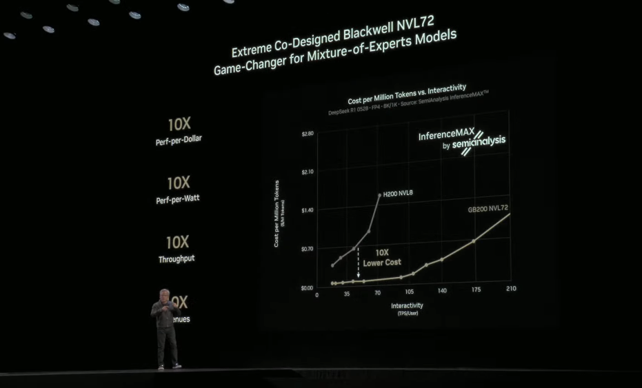 黄仁勋特别强调,通过在更多GPU之间更好地分配推理任务,GB200 NVL72 AI超级计算机的性能提高了10倍,同时运行成本也降低了10倍——AI正变得对所有人更加可及。