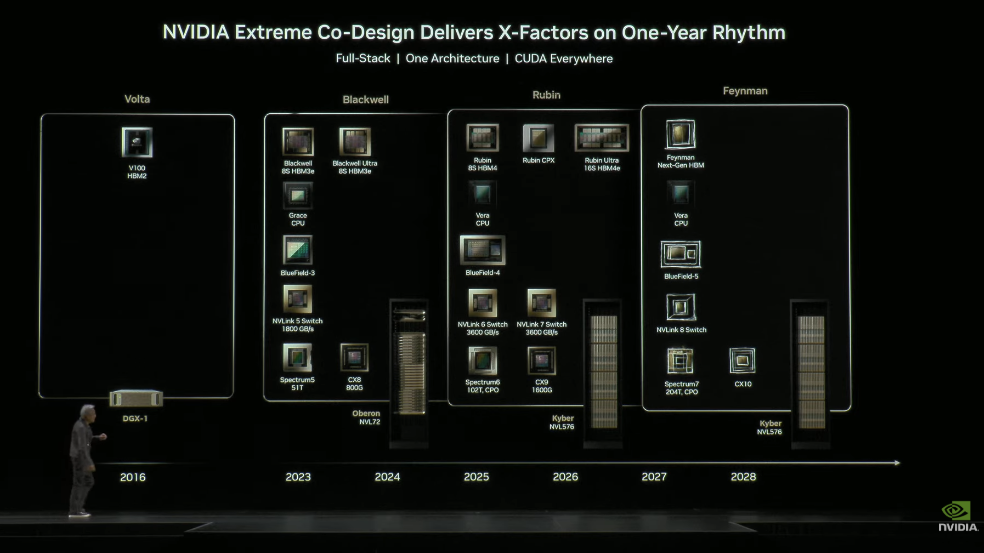 他还在现场展示了英伟达截至2028年的GPU路线图,以及下一代Vera Rubin架构芯片的样机。这款产品可能要到明年此时或更晚一些才能量产发货。