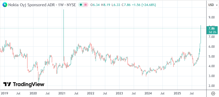 受此重大利好消息影响,诺基亚美股股价在当日交易中一度飙升近30%,最高触及8.19美元,创下了自2021年1月以来的最高交易记录。尽管随后股价有所回落,但截至收盘,诺基亚股价仍大幅上涨22.99%,报收于每股7.779美元,显示出市场对这一战略合作的高度认可。