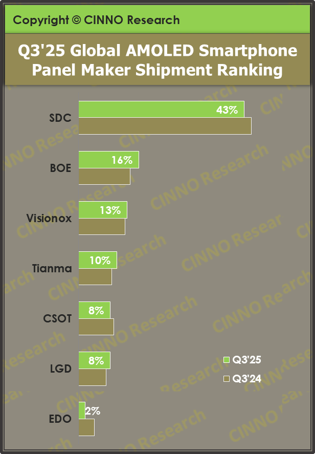 CINNO Research最新报告显示,随着2025年第三季度传统销售旺季的到来,全球AMOLED智能手机面板市场迎来显著增长。据统计,该季度全球AMOLED智能手机面板出货量约达2.5亿片,与去年同期相比增长了11.7%,同时与上一季度相比也实现了20.3%的环比增长,成功实现同比与环比的双增长态势,市场景气度持续回升。