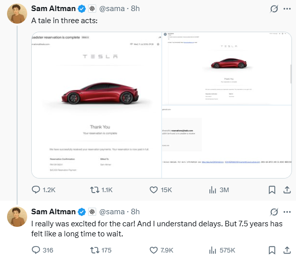奥尔特曼在另一条帖子中表示,他对这款跑车充满期待,也理解交付可能出现的延期,但长达七年半的等待时间实在令人难以接受。