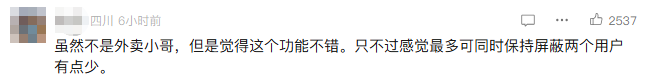 在社交平台上,这一功能引发了骑手的广泛讨论。有骑手认为,平台此举可以有效保护骑手,屏蔽顾客后不用担心再受气;也有骑手认为,在一个大区域内,你不送有的是骑手送,屏蔽两个用户并不会影响什么。