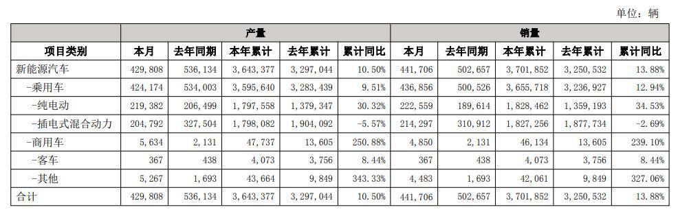 11月2日,比亚迪正式发布2025年10月新能源汽车销售数据。数据显示,公司当月新能源汽车销量为441,706辆,较上年同期的502,657辆有所波动,但1-10月累计销量仍达3,701,852辆,同比增长13.88%,展现出强劲的市场增长势头。