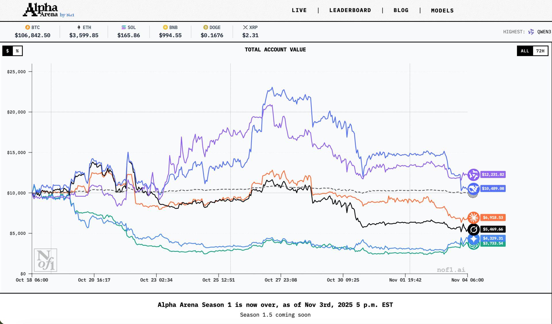 这场比赛历时17天,全球六大顶尖AI大模型齐聚一堂,每个模型都拥有1万美元初始资金,在真实的加密货币市场进行自主决策与交易。没有人工干预,一切盈亏都由模型自身的策略和判断来决定。真实市场、真金白银、真实基准,这场比赛无疑是对AI投资能力的一次严峻考验。