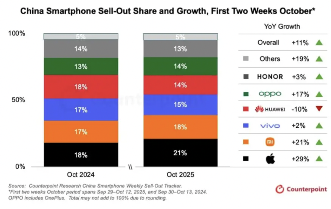 10月前两周中国智能手机市场份额及销量情况 图片来源:Counterpoint