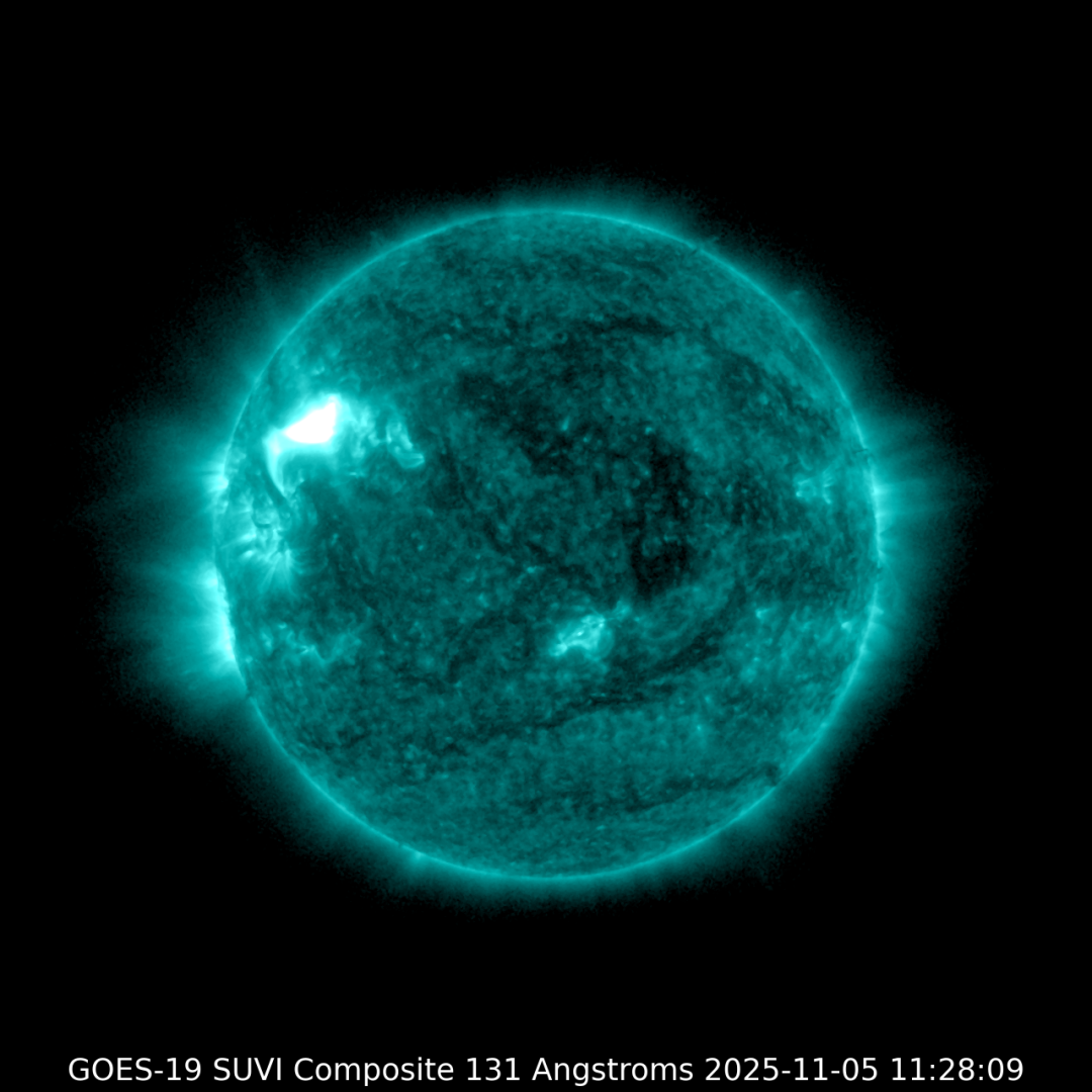 图中圆盘区域为131埃波段下的太阳观测图像,左侧偏上的白色高亮区域即为太阳耀斑发生位置。(图片来源:空间天气)