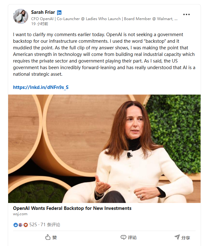 然而,Friar本人后来在领英(LinkedIn)的一篇帖子中软化了立场,称OpenAI并没有为其基础设施承诺寻求政府支持。她解释道:“我使用的‘担保’一词模糊了我的观点。我的意思是,美国在技术方面的实力将来自于构建真正的产业产能,这需要私营部门和政府各司其职、共同努力。”