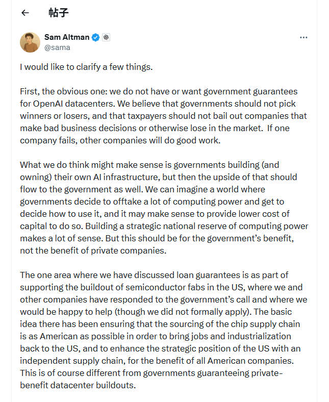 OpenAI首席执行官萨姆·奥尔特曼(Sam Altman)随后也在X上发布长文,呼应了萨克斯的观点。他写道:“我们不需要也不想要政府对OpenAI数据中心的担保。我们认为政府不应该人为地选择赢家或输家,纳税人也不应该救助那些做出错误商业决策或在市场中失败的公司。”