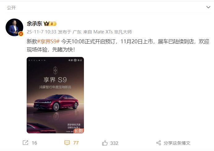 11月7日当天,华为常务董事、产品投资委员会主任、终端BG董事长余承东在社交平台发文,宣布新款享界S9将于11月20日正式上市,同时透露展车已陆续到店,消费者可前往体验。