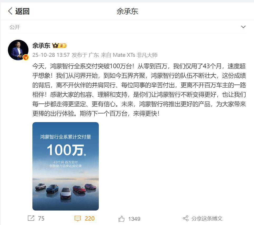 值得一提的是,在10月28日,余承东曾发文庆祝鸿蒙智行全系交付突破100万台。他表示,从问界开始,到如今五界齐聚,鸿蒙智行的队伍不断壮大。这份成绩的背后,离不开合作伙伴的并肩同行、每位同事的辛苦付出,更离不开百万车主的一路相伴。