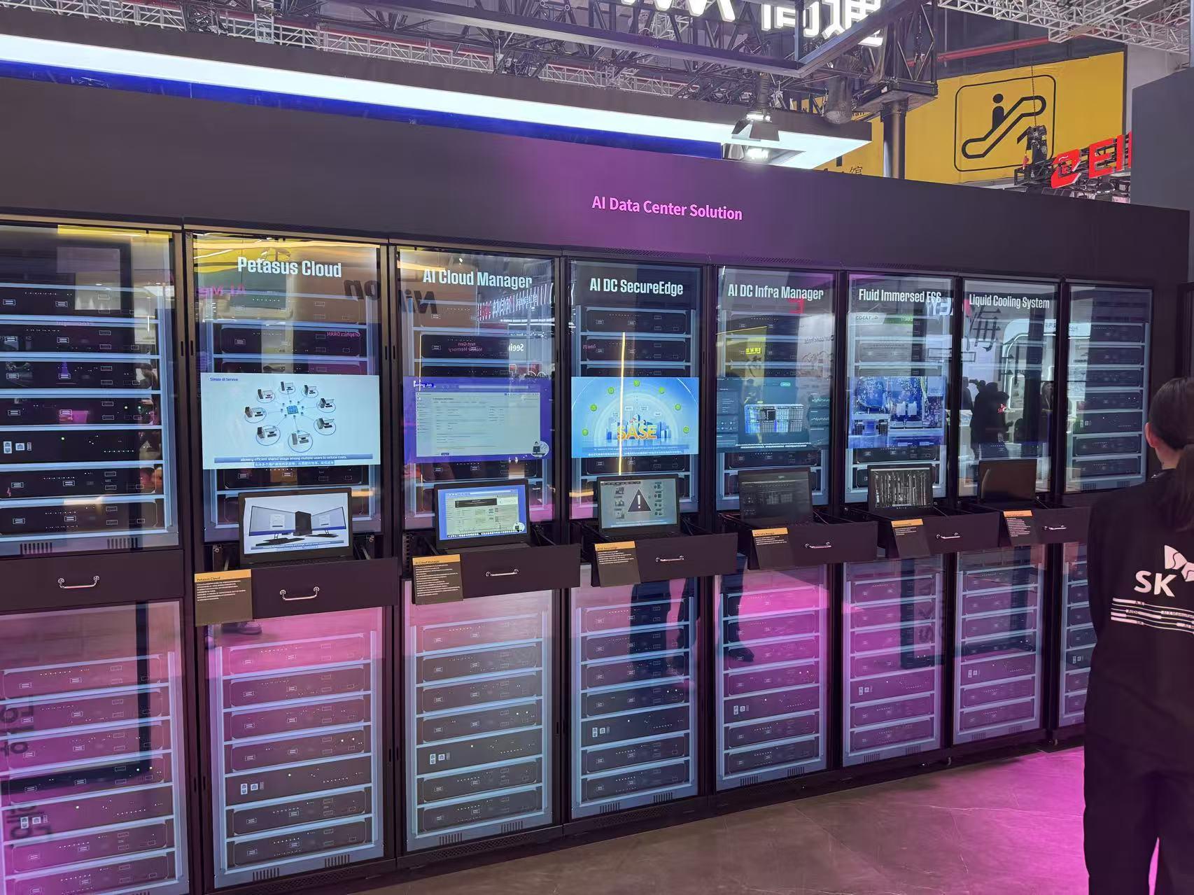 在展台现场,SK海力士展示了基于新一代PIM(Processing in Memory)技术解决方案的产品GDDR6-AiM,以及针对服务器与数据中心多样化容量需求的产品eSSD、高性能服务器用DRAM模组Server DIMM。值得注意的是,SK海力士今年进博会展出了图形用DRAM产品GDDR7,据现场工作人员介绍,相较于前一代,GDDR7运行速度提升60%、能效提升50%以上。此外,SK电讯还将AI数据中心搬进了展台,直观展示了SK集团在存储、冷却、运营、安保等AI基础设施领域的建设成果。