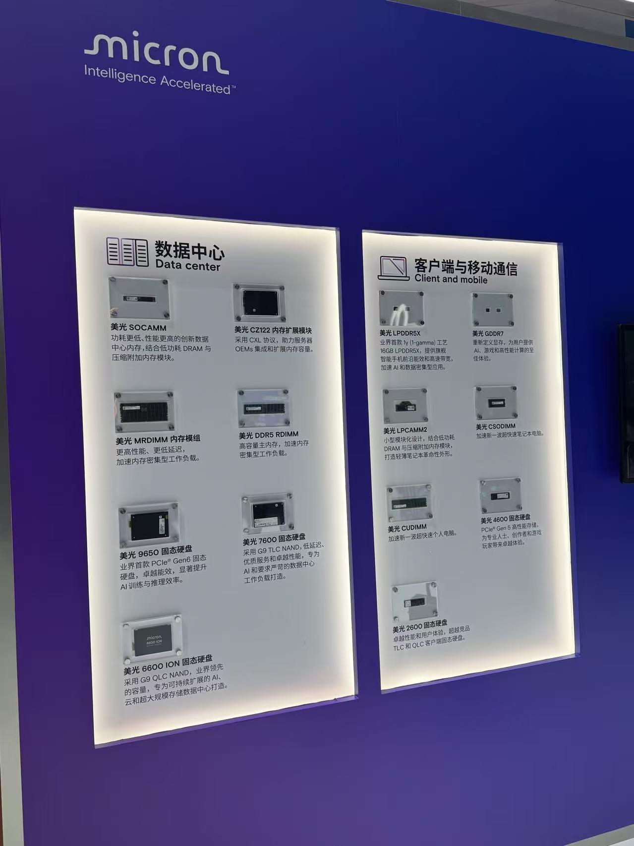美光展台则涵盖了五大主题展区,包括美光中国、美光芯品、美光可持续发展卓越中心、美光职场与企业社会责任和美光客户产品展示区。产品方面,美光展示了数据中心、客户端与移动通信、汽车与本地智能设备等细分领域的相关存储产品。在数据中心新领域,美光展示了其MRDIMM内存模组、DDR5 RDIMM、SOCAMM、CZ122 内存扩展模块、9650 固态硬盘、6600 ION 固态硬盘、7600固态硬盘。其中,9650固态硬盘为业界首款 PCIe® Gen6 固态硬盘,提升了AI训练与推理效率。客户端与移动通信领域,美光展示了GDDR7、LPDDR5X、LPCAMM2、CSODIMM、CUDIMM、4600固态硬盘、2600固态硬盘。LPDDR5X为业界首款1γ(1-gamma)工艺16GB LPDDR5X,提供旗舰智能手机前沿能效和高速带宽,加速AI和数据密集型应用。
