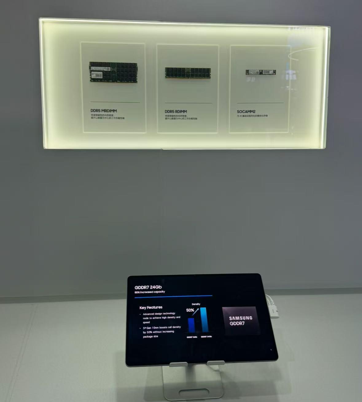 三星在进博会上也展示了应用于数据中心的DDR5 MRDIMM和模块化存储SOCAMM2。现场工作人员表示,DDR5 MRDIMM产品目前已实现量产,但SOCAMM2仍处于概念阶段。另外,三星还展示了DDR5、LPDDR5X、GDDR7 DRAM等存储产品。据悉,美光于今年10月已宣布其192GB SOCAMM2已正式送样。美光资深副总裁暨云端内存事业部总经理Raj Narasimhan曾表示:“随着AI工作负载变得更加复杂而严苛,数据中心服务器必须提升效率,为每瓦特的功率提供更多tokens。凭借在低功耗DRAM领域公认的领先地位,美光能确保我们的SOCAMM2模块提供所需的数据吞吐量、能效、容量和数据中心级别的品质,这些对于驱动下一代AI数据中心服务器至关重要。”