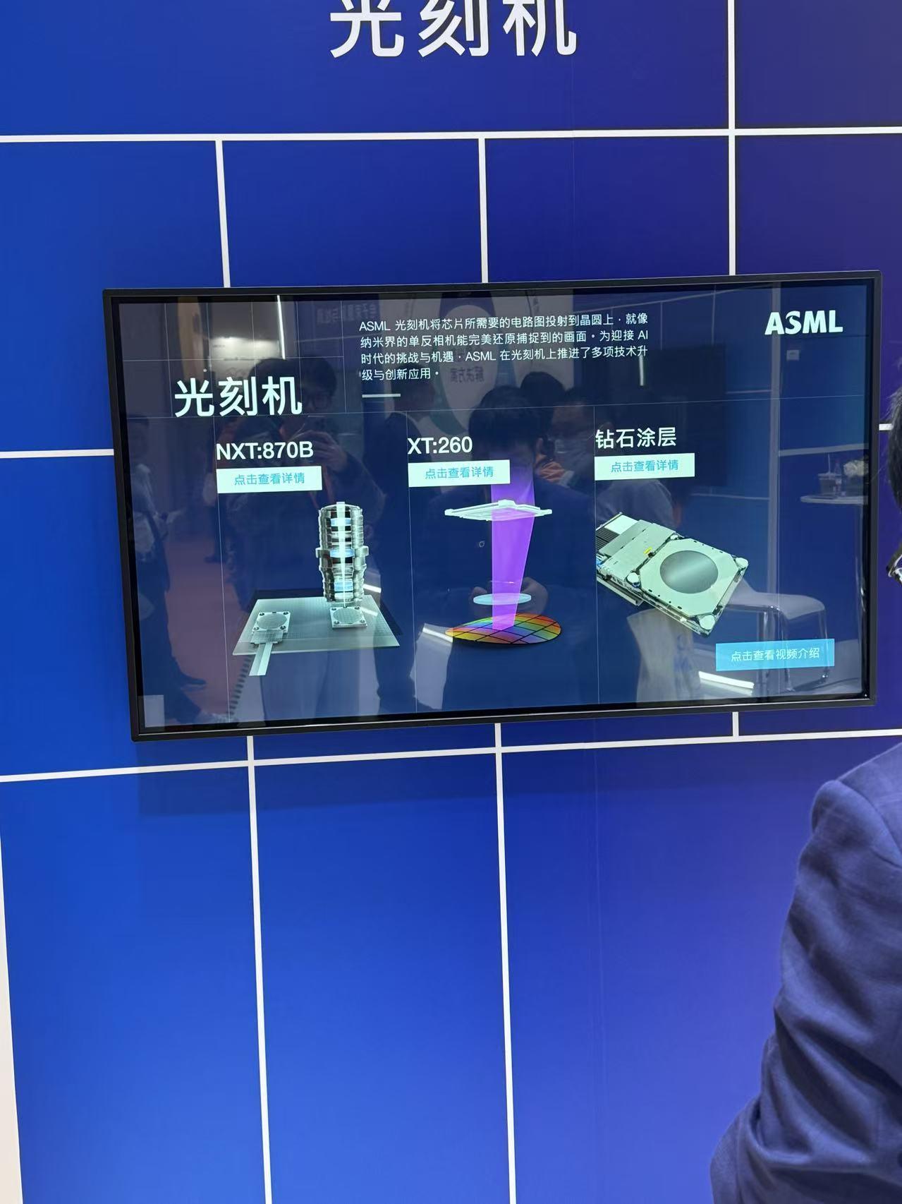 “今年是ASML第七次参加进博会。通过这个促进沟通交流的宝贵平台,我们期待与中国客户、合作伙伴以及行业相关方加强互动。”ASML全球执行副总裁、中国区总裁沈波表示,“AI正驱动全球对不同制程节点芯片的需求不断增长,其中主流芯片在这一增长趋势中发挥着重要作用。依托ASML全景光刻解决方案,我们致力于帮助中国客户把握主流芯片市场机遇。”在本届进博会上,ASML在展台以数字化方式展示了其全景光刻解决方案下的部分亮点产品和技术。在光刻机领域,ASML展示的DUV光刻机包括TWINSCAN XT:260、TWINSCAN NXT:870B。其中,TWINSCAN XT:260这款i-line光刻机是ASML首款可服务于先进封装领域的光刻系统,通过光学系统的创新,具有大视场曝光,相较于现有机型可提高4倍生产效率,能够有效提升性能并降低单片晶圆成本。除先进封装外,TWINSCAN XT: 260还可支持主流市场的其他广泛应用。TWINSCAN NXT:870B在升级的光学器件和最新一代磁悬浮平台的支持下,可实现每小时晶圆产量(wph)400片以上,并为键合后的套刻和阶梯式工艺提供校正能力。