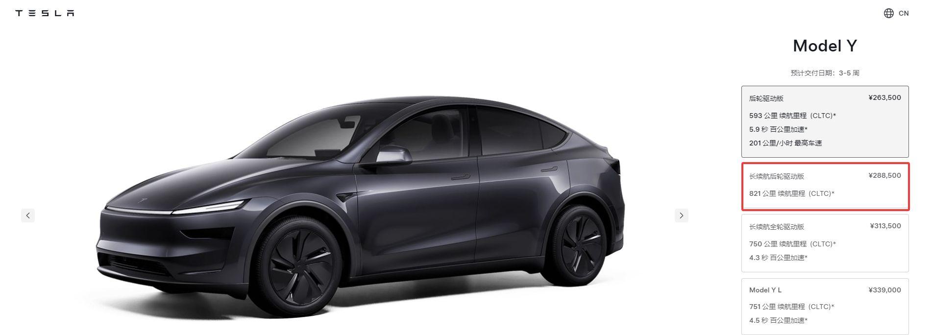 11月8日,据特斯拉中国官网显示,Model Y长续航后轮驱动版正式开售,28.85万元起售。