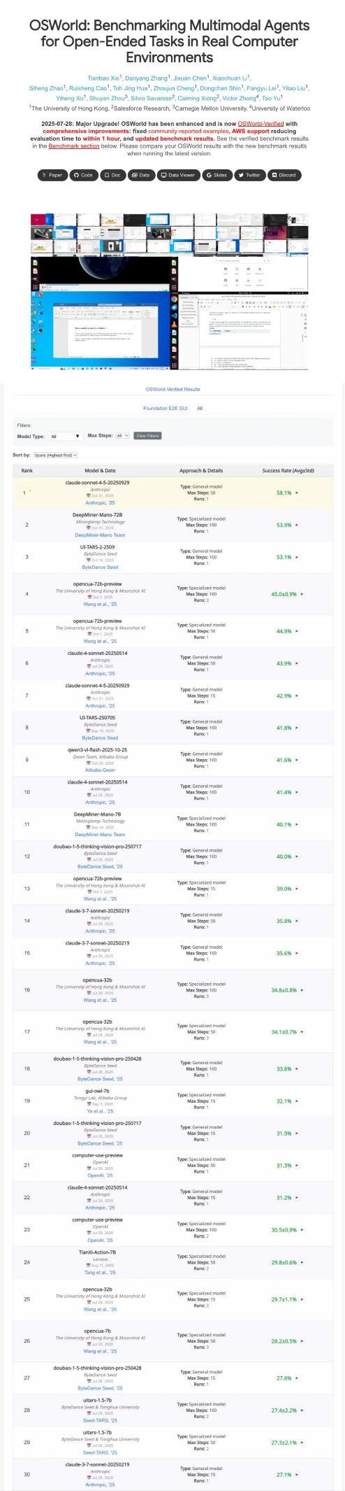 据OS-WorldE2E官方榜单最新数据(截至2025年10月),明略科技自主研发的GUI智能体大模型Mano以54.0%的任务成功率刷新纪录,在Specialized模型分类中位列全球第一,总榜排名第二,仅次于Anthropic最新发布的Claude 4.5。