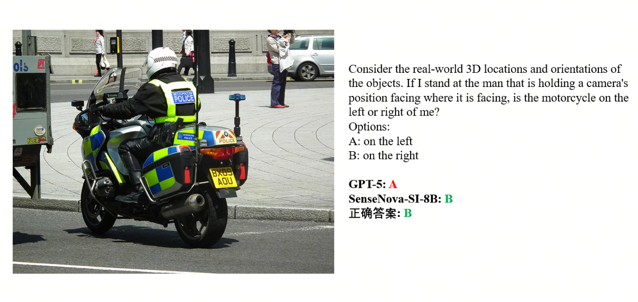 具体技术方案将于近期发布的技术报告中详细披露。从已公布的对比案例可见:在立方体组合俯视图选择任务中,SenseNova-SI-8B正确识别出答案B,而GPT-5选择错误;在摩托车位置判断任务中,该模型准确判断出物体位于右侧,再次超越GPT-5的错误判断。