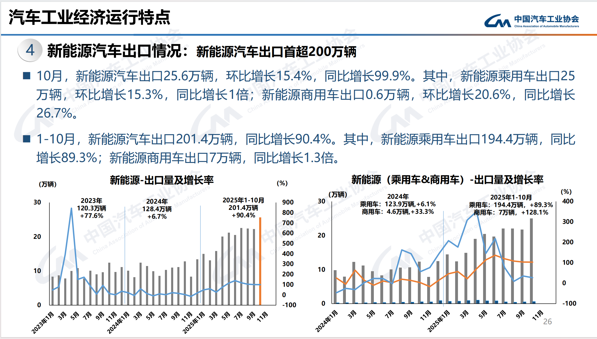 出口层面,2025年1至10月,我国新能源汽车出口首次突破200万辆,达201.4万辆,同比增长90.4%,成为汽车出口增长主引擎。同期,汽车出口561.6万辆,同比增长15.7%。其中,10月出口66.6万辆,环比增长2.1%,同比增长22.9%,连续三个月维持在60万辆以上水平。