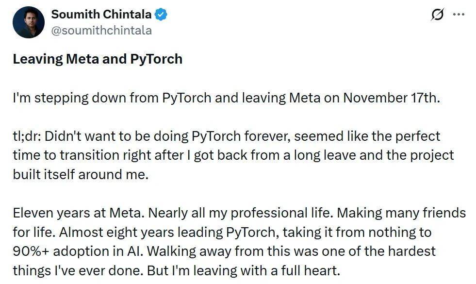 而在数天之前,PyTorch 之父 Soumith Chintala 也宣布将于 11 月 17 日正式离开 Meta,结束他长达 11 年的职业旅程。