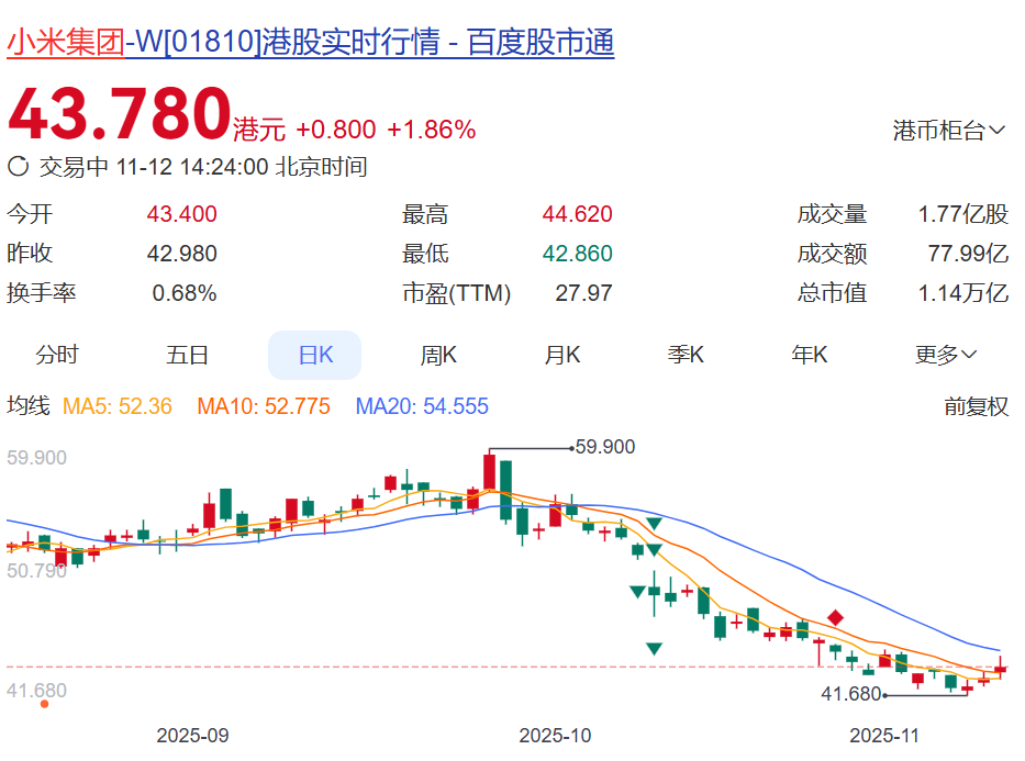 11月12日,小米股价上涨1.86%,总市值1.14万亿港元。