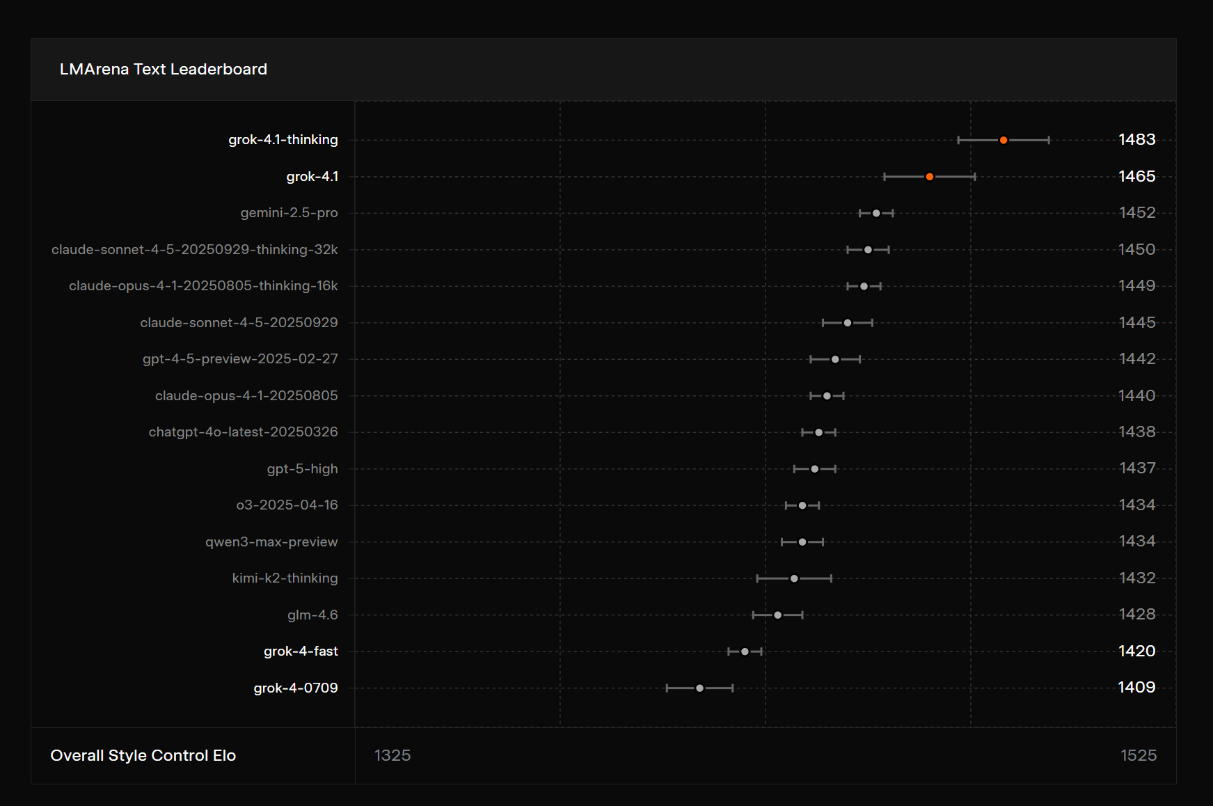 Grok 4.1在盲测的人类偏好评估中,树立了新的行业标准。LMArena,这一开源工具,允许用户通过并排、盲测的方式,直观比较不同大语言模型的表现。在这个竞争激烈的“斗兽场”中,Grok 4.1取得了令人瞩目的成绩: