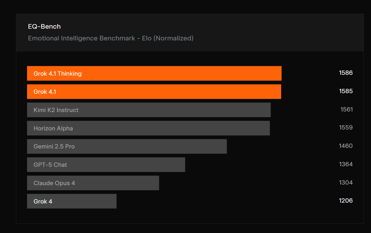 为评估模型在个性与人际互动方面的进展,xAI对Grok 4.1进行了EQ-Bench3测试。这是一项由LLM作为裁判的测试,旨在全面评估模型在主动情绪智能、理解力、洞察力、共情能力及人际技能等方面的表现。