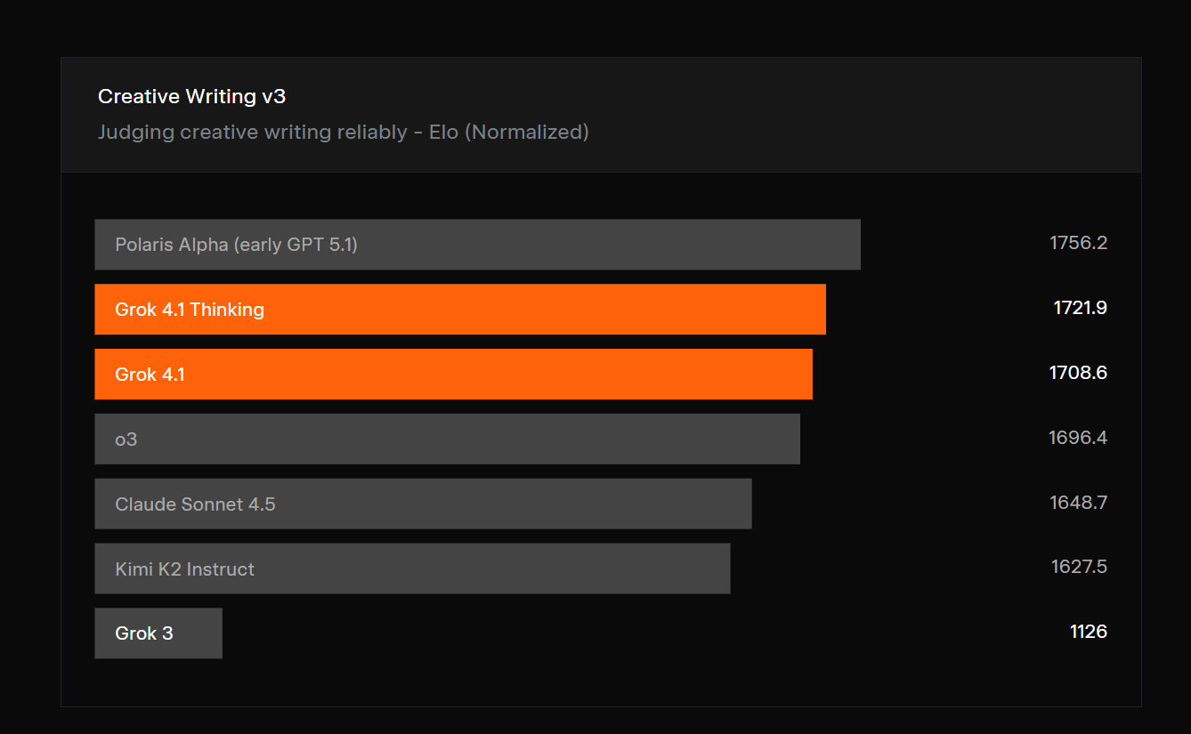 xAI同样对Grok 4.1在Creative Writing v3基准测试中的表现进行了测量。在该测试中,模型需根据32个不同的写作提示,在3次迭代中生成回答,以展现其创意写作能力。