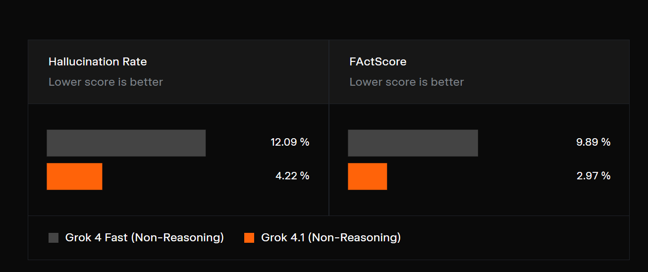 快速响应模型在配备搜索工具后,虽能迅速给出答案,但往往更容易出现事实性错误。为解决这一问题,xAI在Grok 4.1的后训练阶段,重点降低了模型在信息查询类提示中的事实性“幻觉”现象。