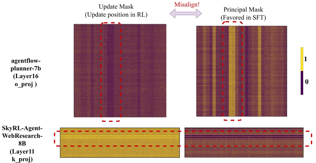 如下所示,在训练过程中,RL会把更新集中在同一模型的相同区域。
