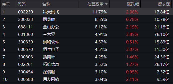 截至13:30,软件50ETF(159590)标的指数热门成分股多数飘红:三六零、恒生电子涨超3%,科大讯飞、金山办公涨超2%,同花顺、润和软件微涨,显示市场对AI应用板块的强烈信心。