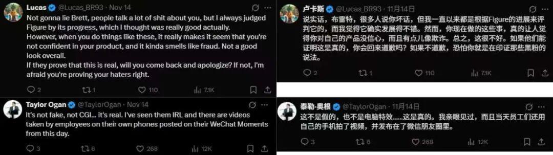 该言论迅速引发技术圈热议。部分海外网友提供反驳证据,称“有员工在交付现场拍摄了未经剪辑的视频并发布于微信朋友圈”,另有网友质疑Brett Adcock的动机:“公开质疑竞争对手是否源于对自身产品的不自信?”