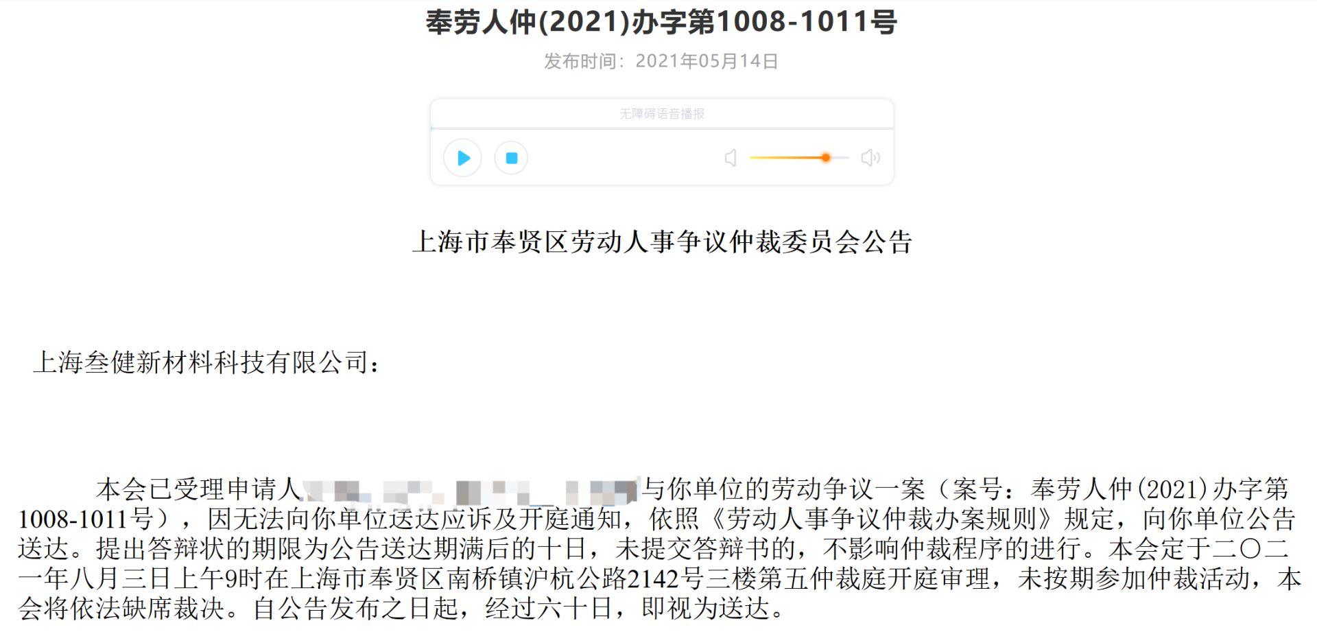 巧合的是,2021年5月,上海市奉贤区人力资源和社会保障局披露了一则受理通知,4名自然人因与上海叁健存在劳动争议,将上海叁健告到仲裁庭。同期披露的详细信息显示,其中至少3人在2020年6月后受聘进入上海叁健工作,但并未签订劳动合同。