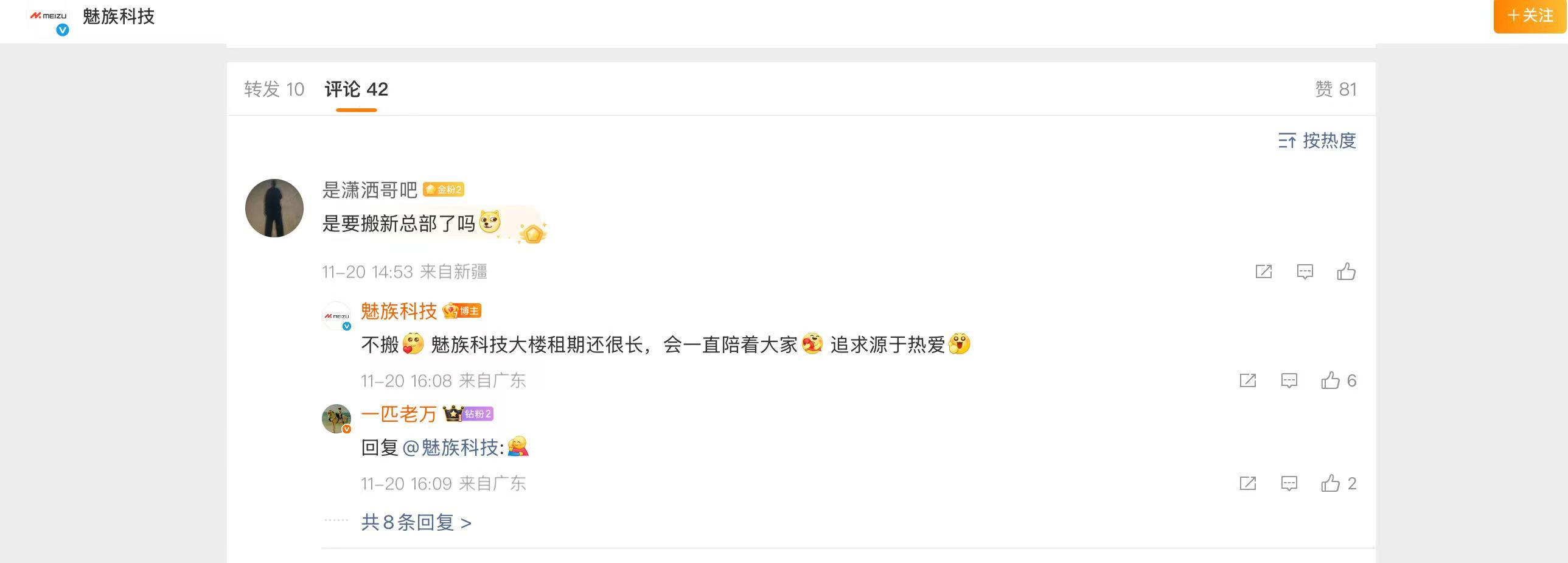 针对这一传闻,魅族科技迅速在官方微博账号评论区作出回应。有网友留言询问:“是要搬新总部了吗?”魅族科技明确表示:“不搬,魅族科技大楼租期还很长,会一直陪着大家,追求源于热爱。”这一回应有效平息了外界的猜测和疑虑。