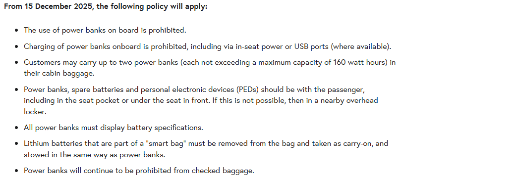 根据新规,乘客将被禁止在航班飞行过程中使用充电宝或为其充电,但可携带最多两件容量不超过160瓦时(Wh)的便携式充电设备。该限制适用于所有随身行李,需确保设备处于关闭状态并妥善保管。澳航集团安全部门负责人强调,此举是响应澳大利亚民航安全管理局(CASA)的最新安全指引。