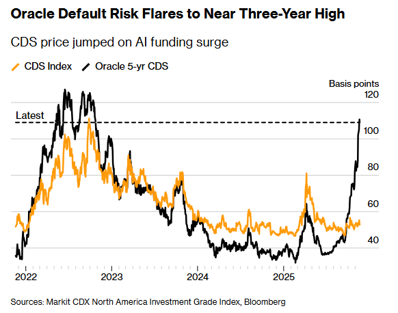 近月来,交易员们不断蜂拥买入甲骨文的信用违约互换(CDS)合约。鉴于该公司正大规模投入人工智能领域、在错综复杂的交易网络中扮演核心角色,且信用评级逊于微软和谷歌母公司Alphabet等同行,这些因素使其CDS合约成为市场对冲乃至做空AI热潮的首选工具。