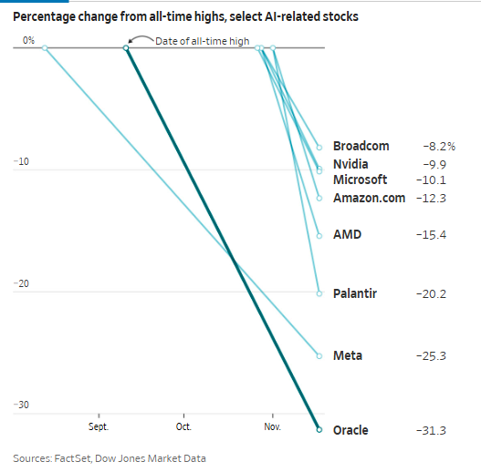 如下图所示,当是截至本周三(在周四进一步暴跌之前),甲骨文股价便已从9月10日高位下跌了约三分之一,领跌一众AI概念股。