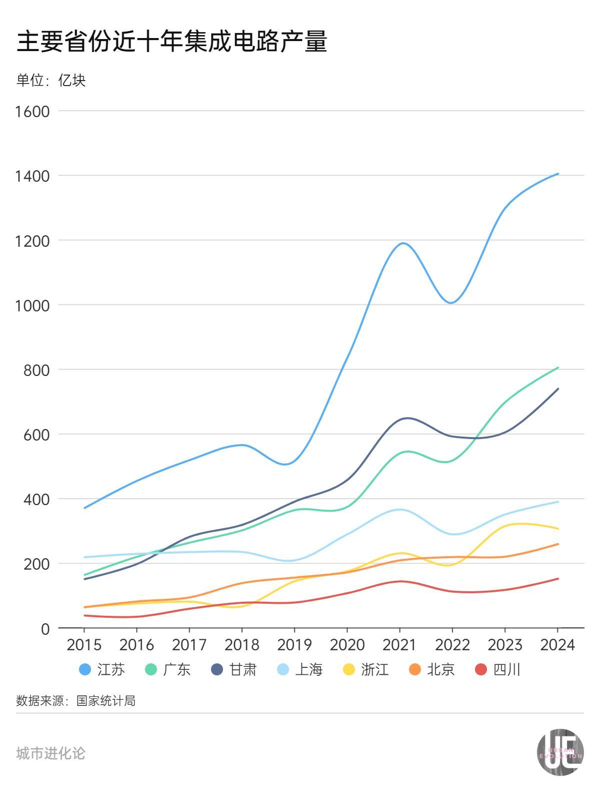 2024年,甘肃的集成电路产量达到了惊人的738.4亿块,仅次于江苏和广东,位居全国第三,产量约为第四名上海的两倍。