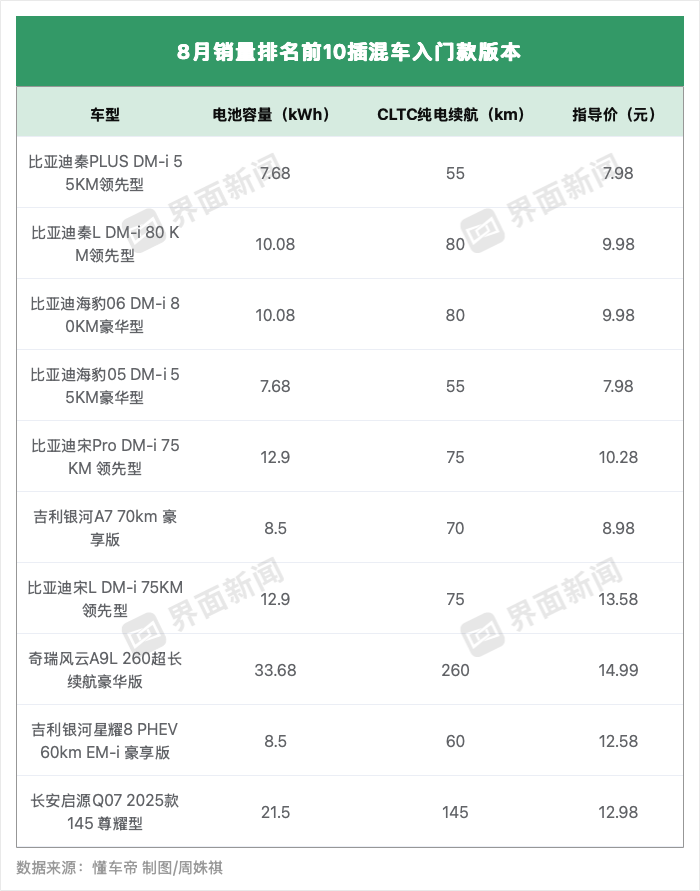 新政对10万元级插混市场冲击显著。比亚迪、吉利、长安等企业的多款入门车型纯电续航不足100公里,这些产品是品牌摊薄成本、支撑销量的核心。