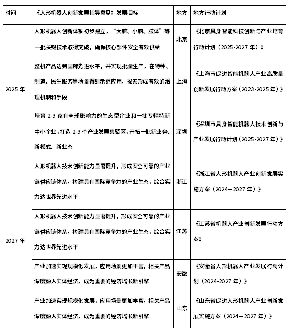 表1:《人形机器人创新发展指导意见》发展目标及地方行动计划